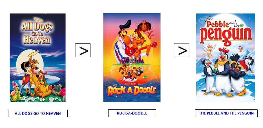 2. Well omg. I love almost all those!! Secret of Nimh, American Tail, Anastasia, Land Before Time, and All Dogs. They are all ones I watched countless times as a child. Heck, I even watch them still today. You’re not a fan of him?!