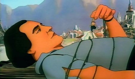 Previous Image Next Image Gulliver’s Travels “You’re lucky I don’t eat finger foods!” Gulliver awakens and discovers he’s tied down in Lilliput in “Gulliver’s Travels.”